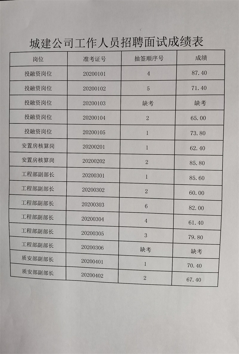 宜昌市點(diǎn)軍城鄉(xiāng)建設(shè)開發(fā)有限公司2020年公開招聘工作人員面試于2020年12月12日結(jié)束,現(xiàn)將面試成績公示如下,如有疑問請(qǐng)于工作日撥打公司電話咨詢。電話為0717-6622026,公示期5天。