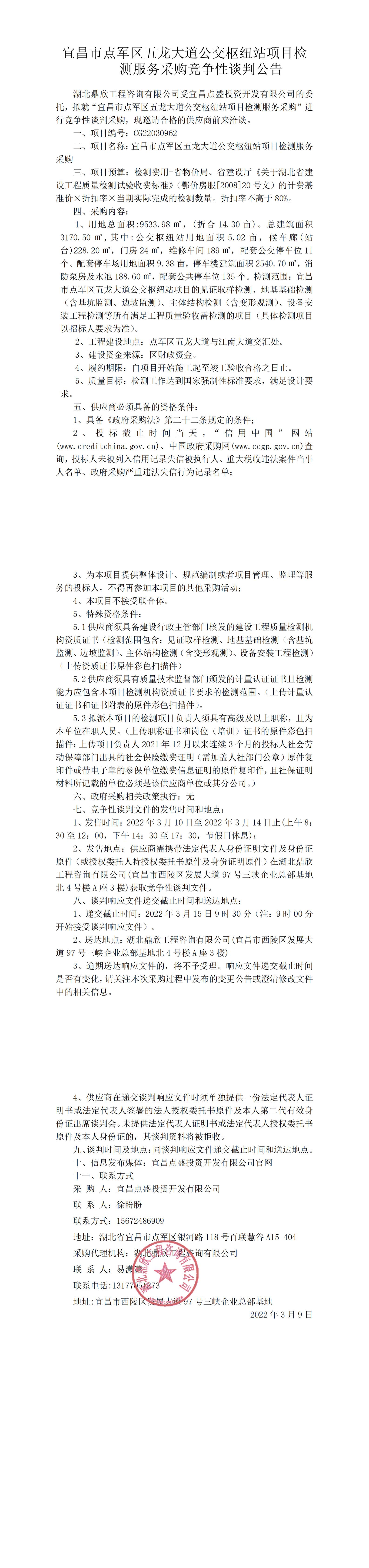 宜昌市點軍區(qū)五龍大道公交樞紐站項目檢測服務(wù)采購競爭性談判公告