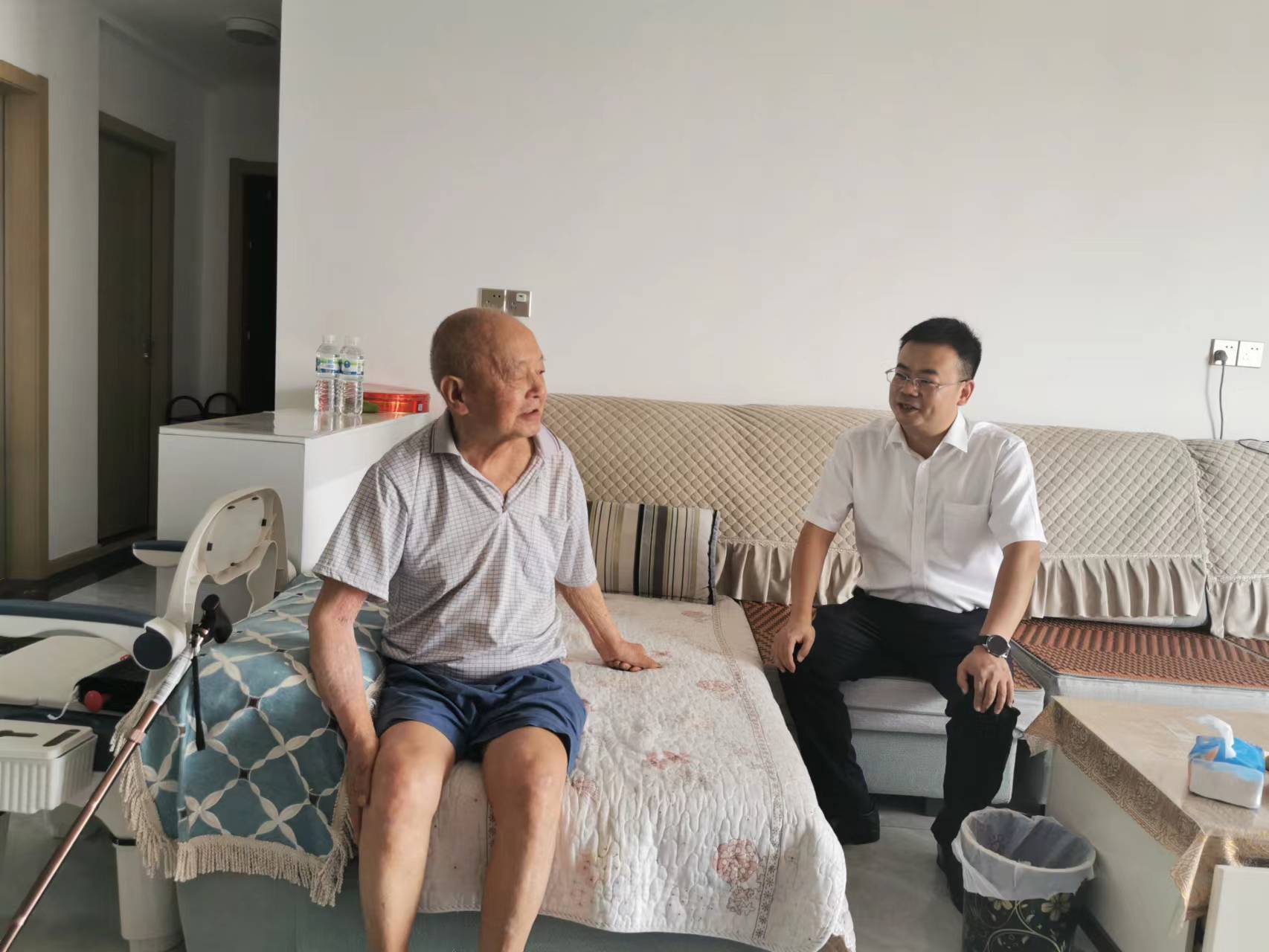 在老黨員劉世松家中,楊濤親切詢問了劉老的身體狀況和生活情況,得知?jiǎng)⒗显跇蜻叴逦瘯?huì)工作,現(xiàn)已85歲高齡,2018年患中風(fēng)后,腿腳不便,致使出行困難,但仍積極參加橋邊村黨支部活動(dòng),為村集體經(jīng)濟(jì)建設(shè)和基層治理建言獻(xiàn)策。