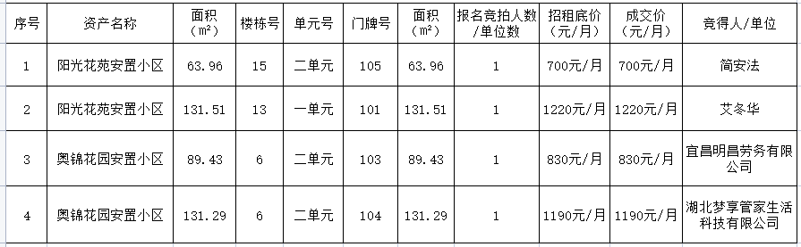 根據(jù)《點(diǎn)軍區(qū)出資企業(yè)資產(chǎn)租賃管理暫行辦法》及《宜昌點(diǎn)盛投資開(kāi)發(fā)有限公司國(guó)有資產(chǎn)經(jīng)營(yíng)使用實(shí)施辦法修訂版(2022.3)》,現(xiàn)對(duì)奧錦花園、陽(yáng)光花苑安置小區(qū)住宅三年租賃權(quán)公開(kāi)招租結(jié)果公告如下: