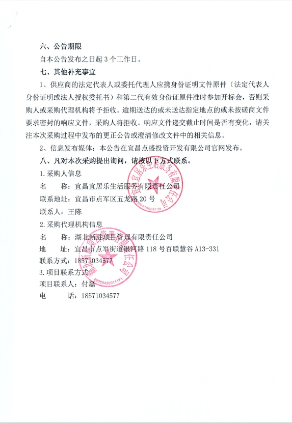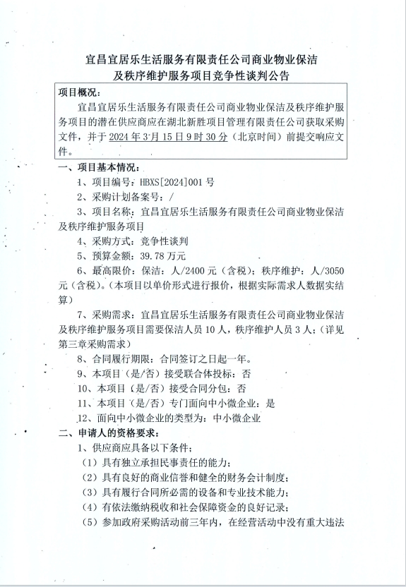 宜昌宜居樂(lè)生活服務(wù)有限責(zé)任公司商業(yè)物業(yè)保潔及秩序維護(hù)服務(wù)項(xiàng)目競(jìng)爭(zhēng)性談判公告