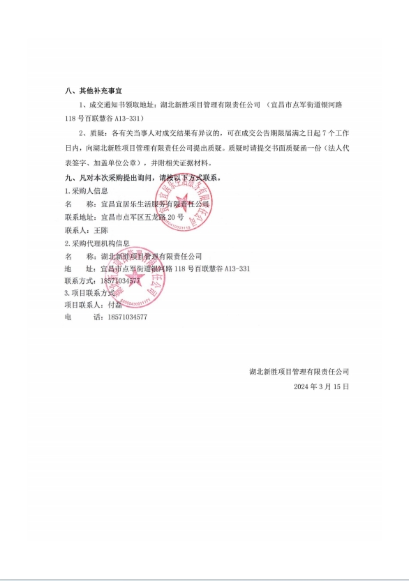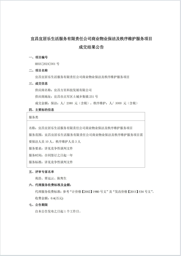 宜昌宜居樂生活服務有限責任公司商業(yè)物業(yè)保潔及秩序維護服務項目成交結果公告