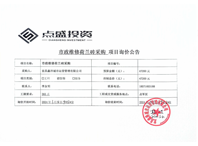 宜昌鑫澤城市運(yùn)營(yíng)管理有限公司市政維修荷蘭磚采購(gòu)項(xiàng)目詢價(jià)公告