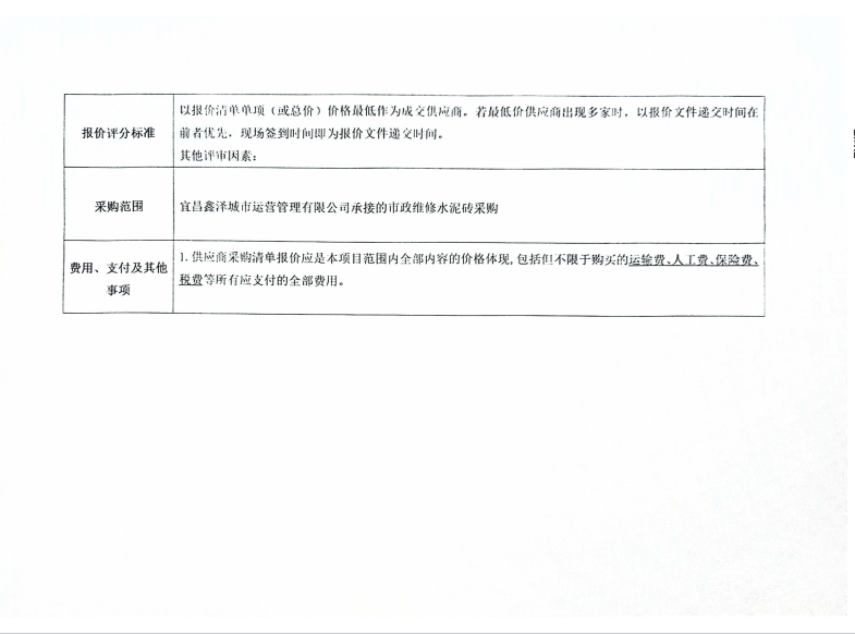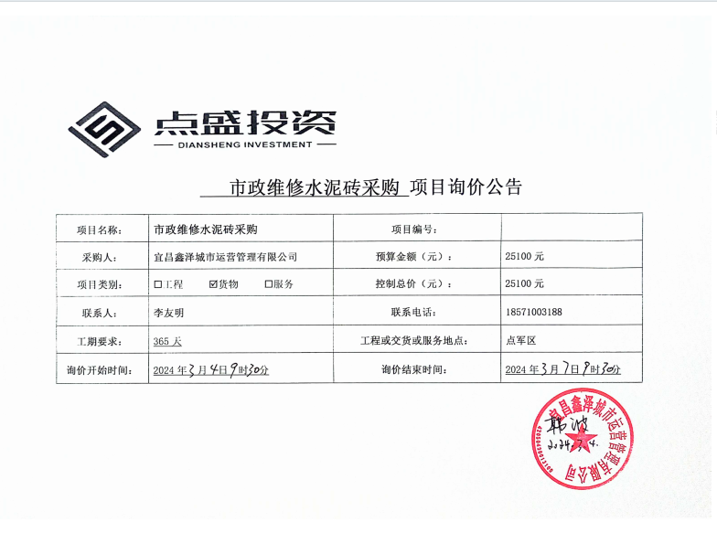宜昌鑫澤城市運(yùn)營管理有限公司市政維修水泥磚采購項目詢價公告