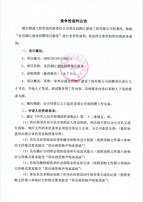宜昌擁江建設(shè)招聘項(xiàng)目服務(wù)競(jìng)爭(zhēng)性談判公告