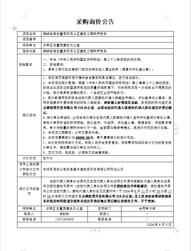 錦繡城南安置房項目B區(qū)建筑工程秩序服務詢價公告
