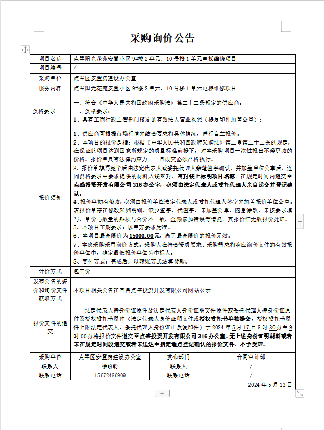 點(diǎn)軍陽光花苑安置小區(qū)9#樓2單元、10號樓1單元電梯維修項(xiàng)目詢價(jià)公告