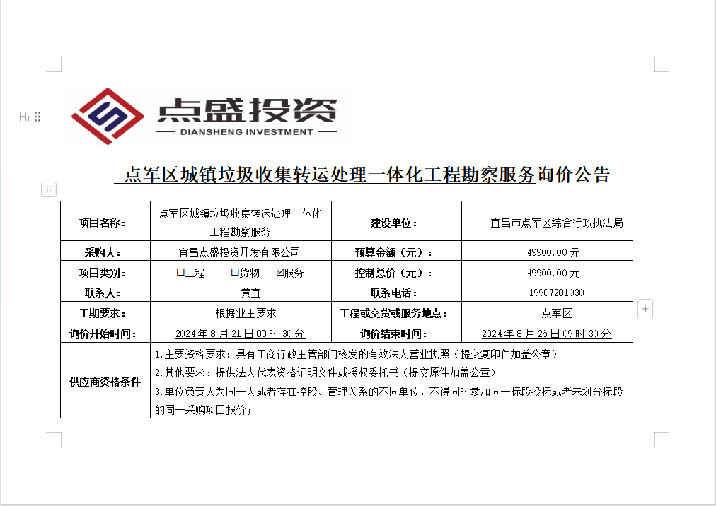 點軍區(qū)城鎮(zhèn)垃圾收集轉(zhuǎn)運處理一體化工程勘察服務詢價公告