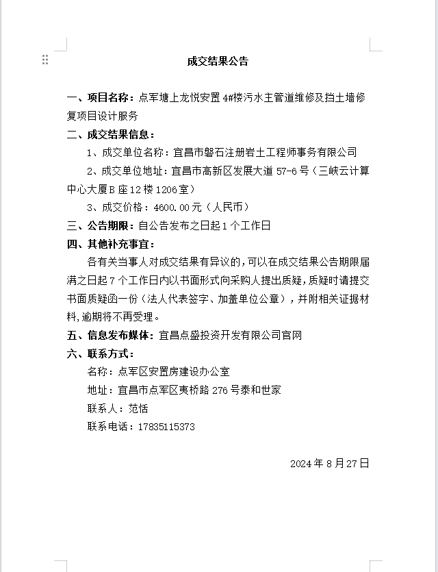 點軍塘上龍悅安置4#樓污水主管道維修及擋土墻修復項目設計服務成交公告