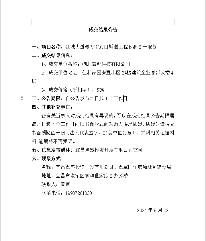 江城大道與將軍路口輔道工程多測合一服務(wù)成交公告