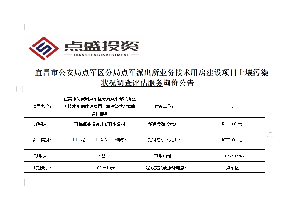 宜昌市公安局點(diǎn)軍區(qū)分局點(diǎn)軍派出所業(yè)務(wù)技術(shù)用房建設(shè)項(xiàng)目土壤污染狀況調(diào)查評(píng)估服務(wù)詢(xún)價(jià)公告