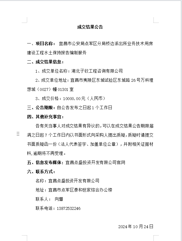 宜昌市公安局點軍區(qū)分局橋邊派出所業(yè)務(wù)技術(shù)用房建設(shè)工程水土保持報告編制服務(wù)成交公告