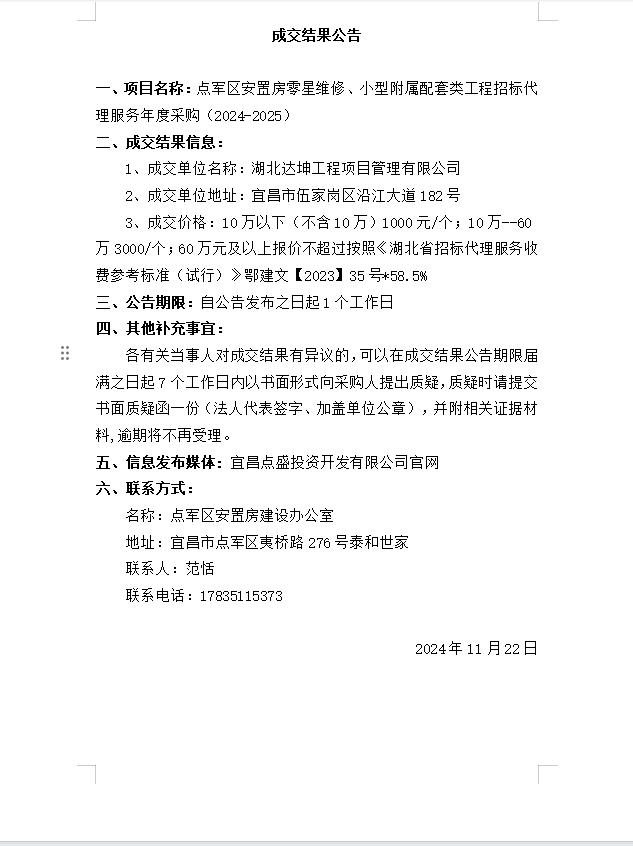 點(diǎn)軍區(qū)安置房零星維修、小型附屬配套類(lèi)工程招標(biāo)代理服務(wù)年度采購(gòu)(2024-2025)成交公告