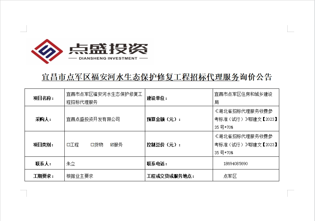 宜昌市點(diǎn)軍區(qū)福安河水生態(tài)保護(hù)修復(fù)工程招標(biāo)代理服務(wù)詢價(jià)公告